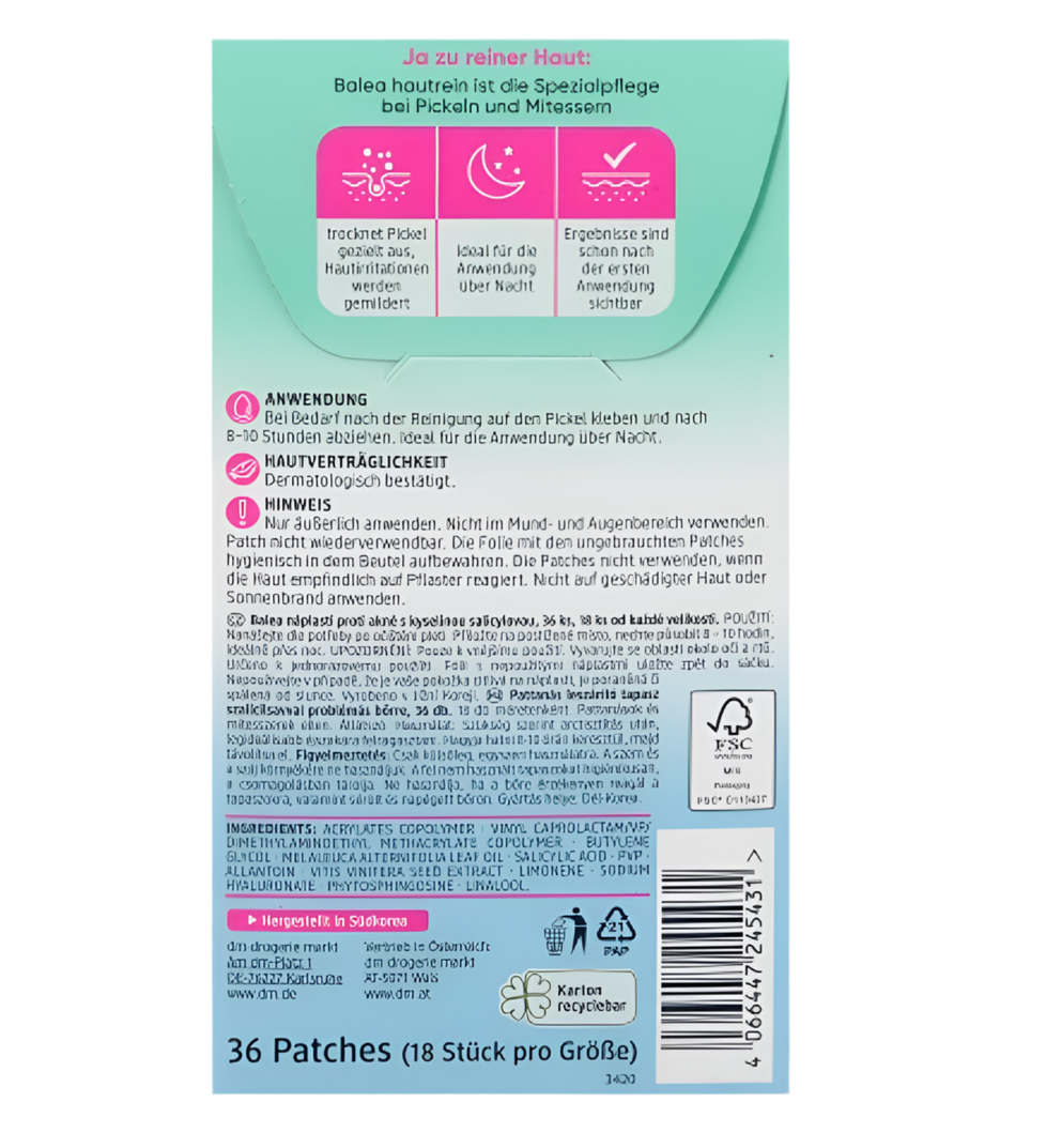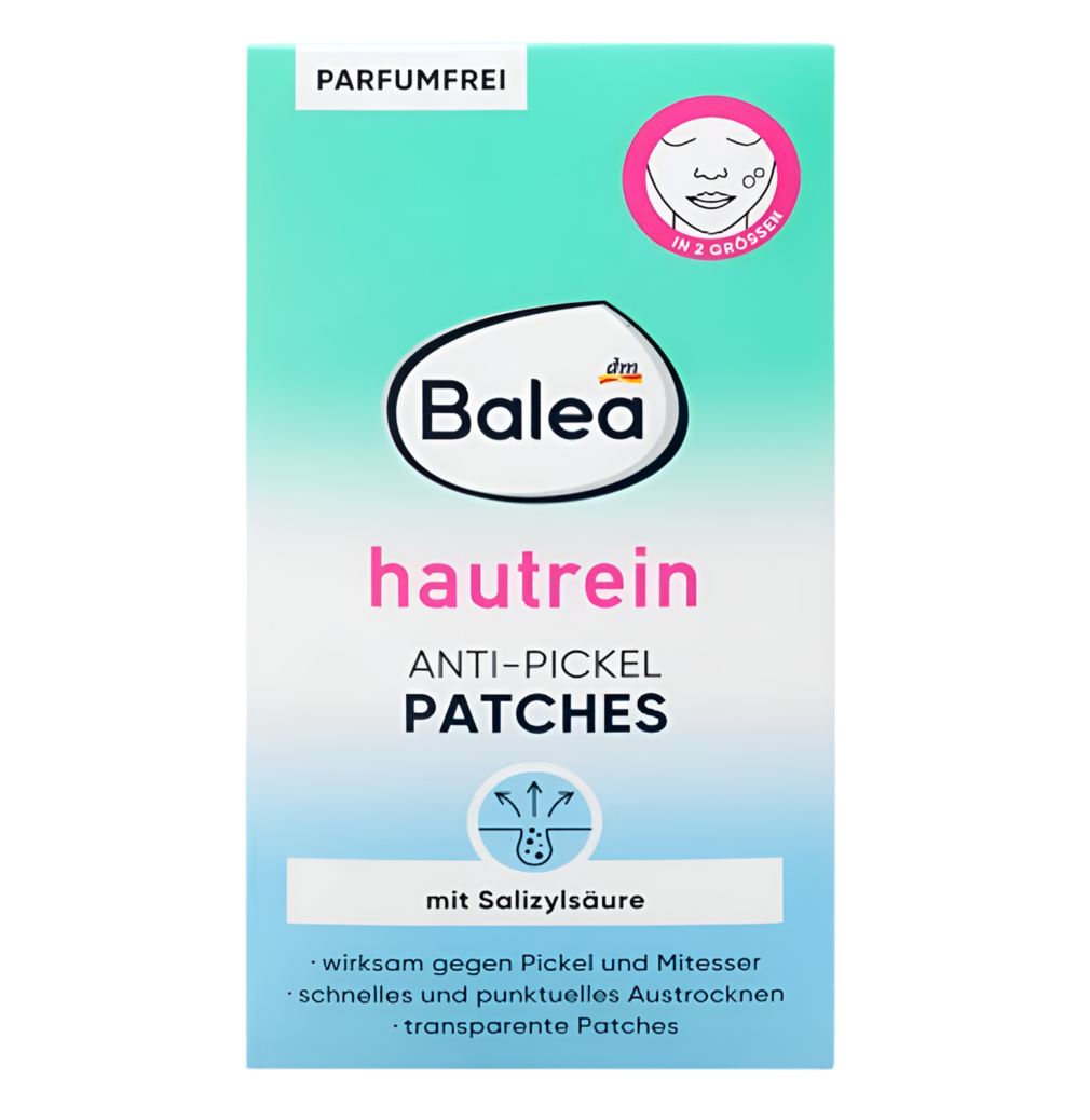 The Clear Skin Anti-Pimple Patches by Balea are a practical solution for the targeted drying of pimples and blackheads. The transparent patches contain salicylic acid, offering antibacterial and soothing effects for the skin. They are quick and easy to use, making them ideal for overnight application. Vegan.
