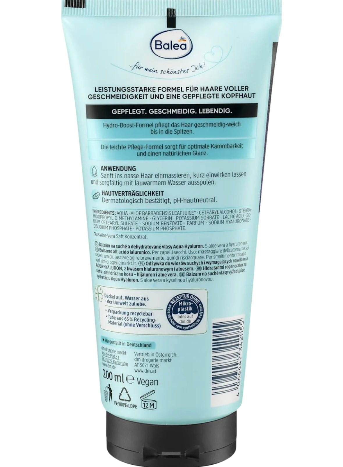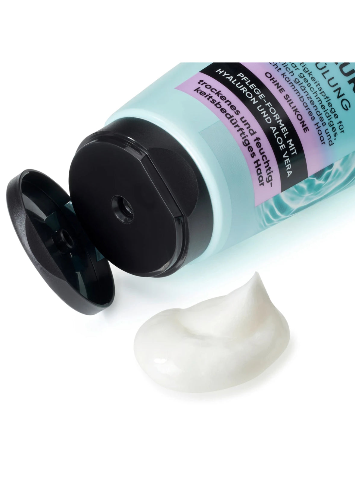 Balea Professional Aqua Hyaluron Conditioner features a formula enriched with natural moisture boosters, hyaluron and aloe vera, that intensely nourishes the hair without weighing it down. This gentle care formula cleanses the hair softly while being extra gentle on the scalp. Experience a moisturized hair feel and noticeable smoothness all the way to the tips. With 40% aloe vera, this silicone-free shampoo is perfect for dry and moisture-deprived hair, and is free from alcohol, ammonia, and is vegan-friendly.