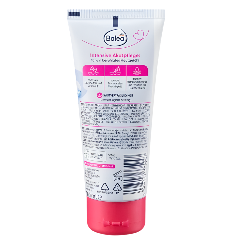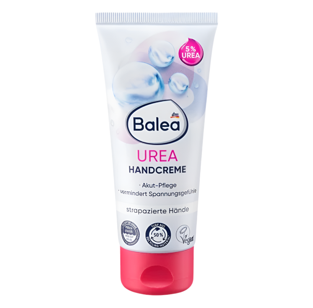 The Balea Hand Cream 5% Urea reduces feelings of tightness in dry hands, provides noticeable moisture, and leaves the skin feeling soft. Its valuable formula with 5% urea offers intensive care for stressed hands and helps the skin retain significant moisture. The shea butter formulation ensures soothing smoothness, while vitamin E combats dryness and improves the skin's surface—leaving hands feeling fully protected. Free from microplastics and water-soluble synthetic polymers.