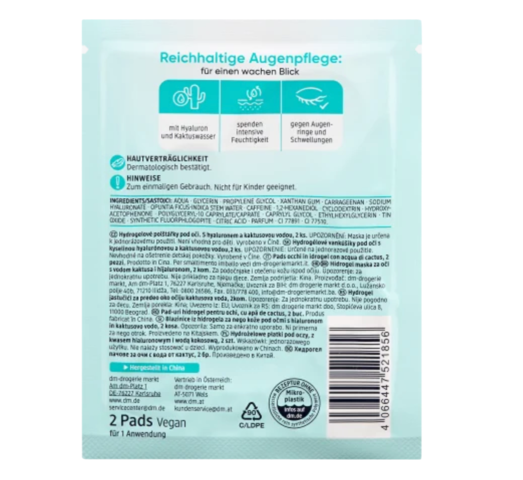 Quick relief for tired eyes: The extra-soft hydrogel eye pads cool the delicate eye area and help reduce puffiness and dark circles. The combination of hyaluronic acid and cactus water provides intense hydration, leaving the eye area refreshed and glowing.