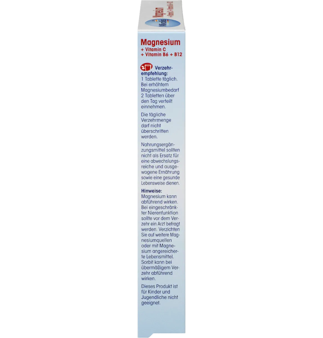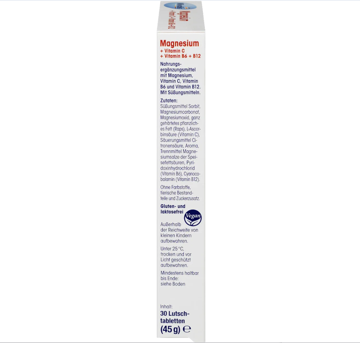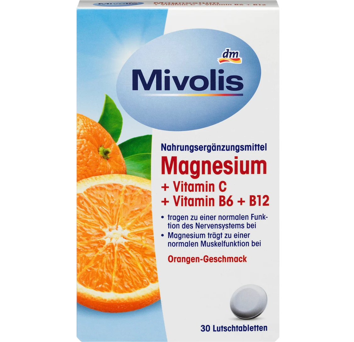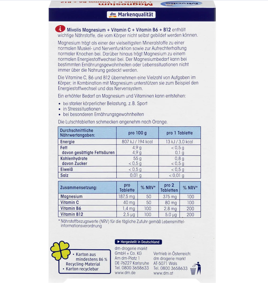 Mivolis Magnesium + Vitamin C + Vitamin B6 + B12 lozenges contain essential nutrients that the body cannot produce itself. Magnesium, as one of the most versatile minerals, contributes to normal muscle and nerve function as well as the maintenance of normal bones. Additionally, magnesium supports a normal energy metabolism. In certain dietary habits or life situations, magnesium needs may not always be met through food alone. Vitamins C, B6, and B12 fulfill numerous tasks in the body; in combination with magnesium, they support the nervous system, for example.