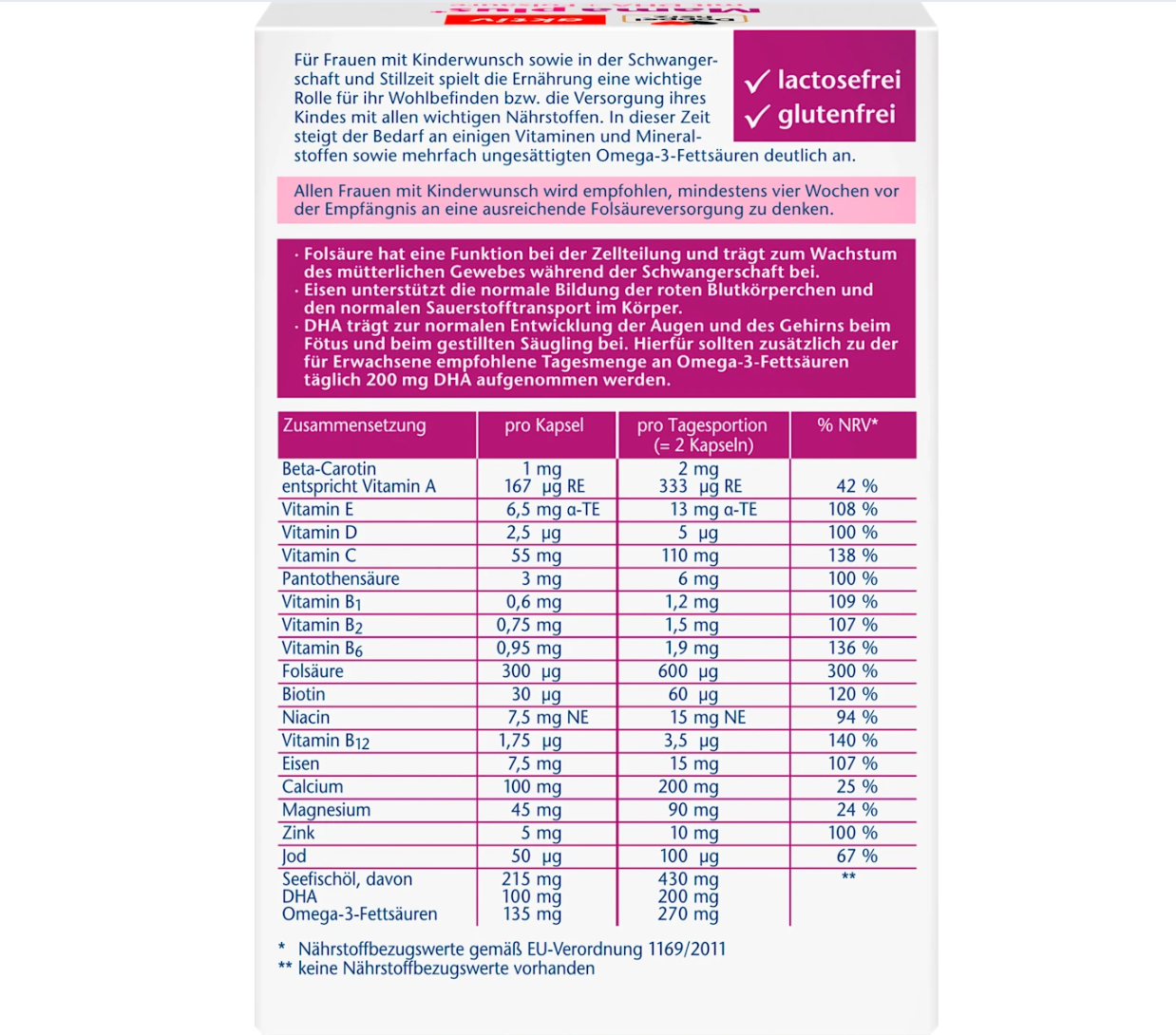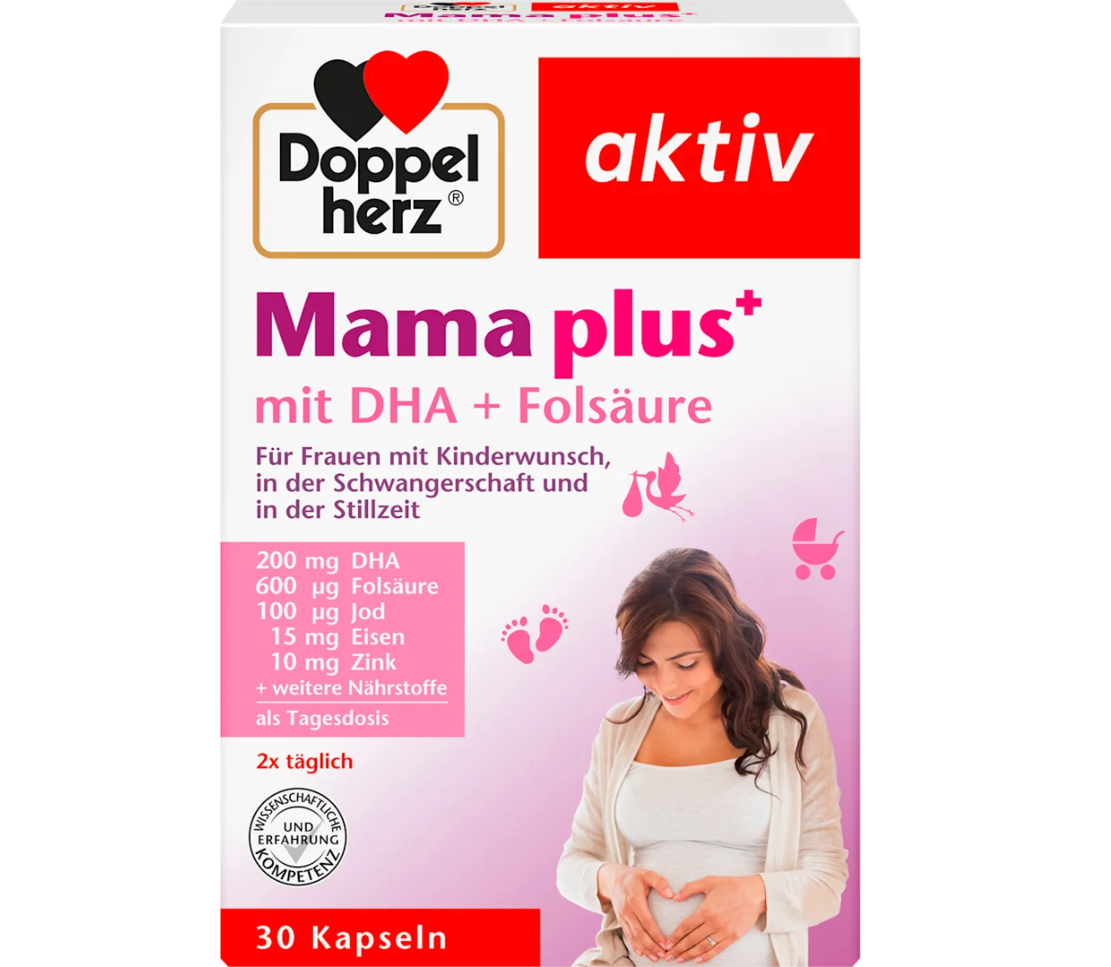 The Doppelherz Mama Plus+ Capsules with DHA + Folic Acid provide 600 μg of folic acid along with all essential B vitamins, as well as the minerals calcium, magnesium, iron, zinc, and 100 μg of iodine. Additionally, the capsules include omega-3 fatty acids, including 200 mg of DHA per day. They are ideal for women planning to conceive, during pregnancy, and breastfeeding, as the need for certain vitamins and minerals significantly increases during these life stages.