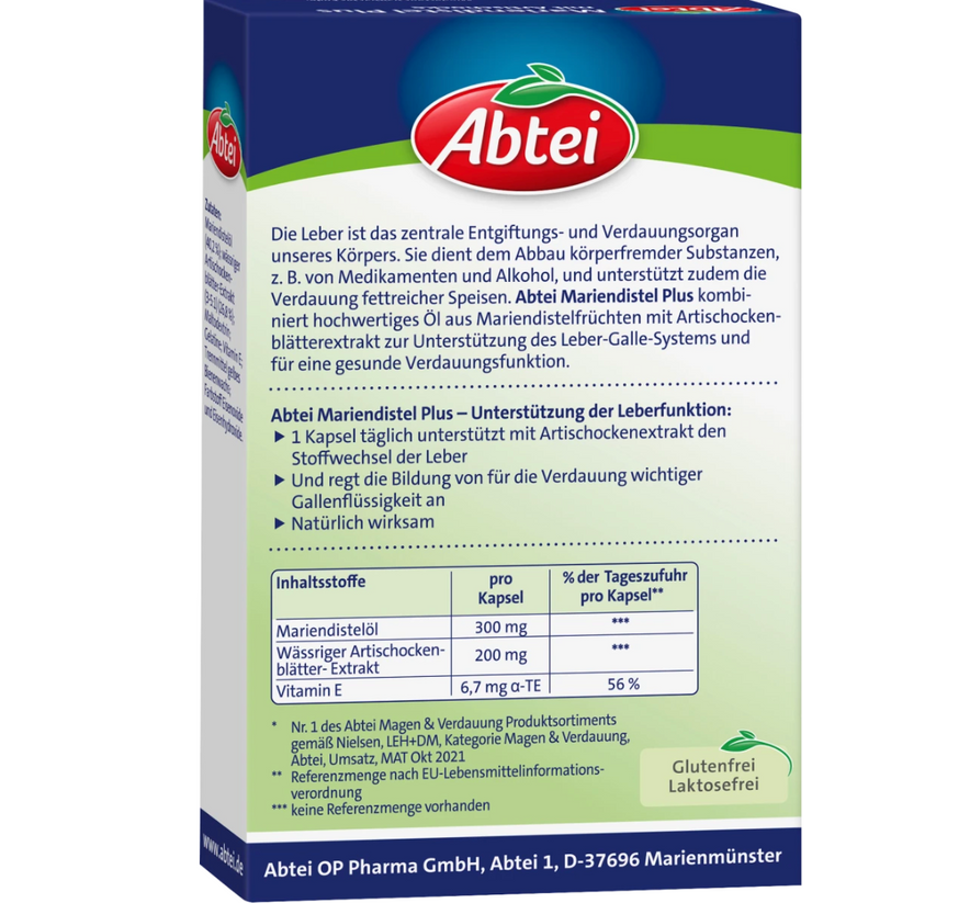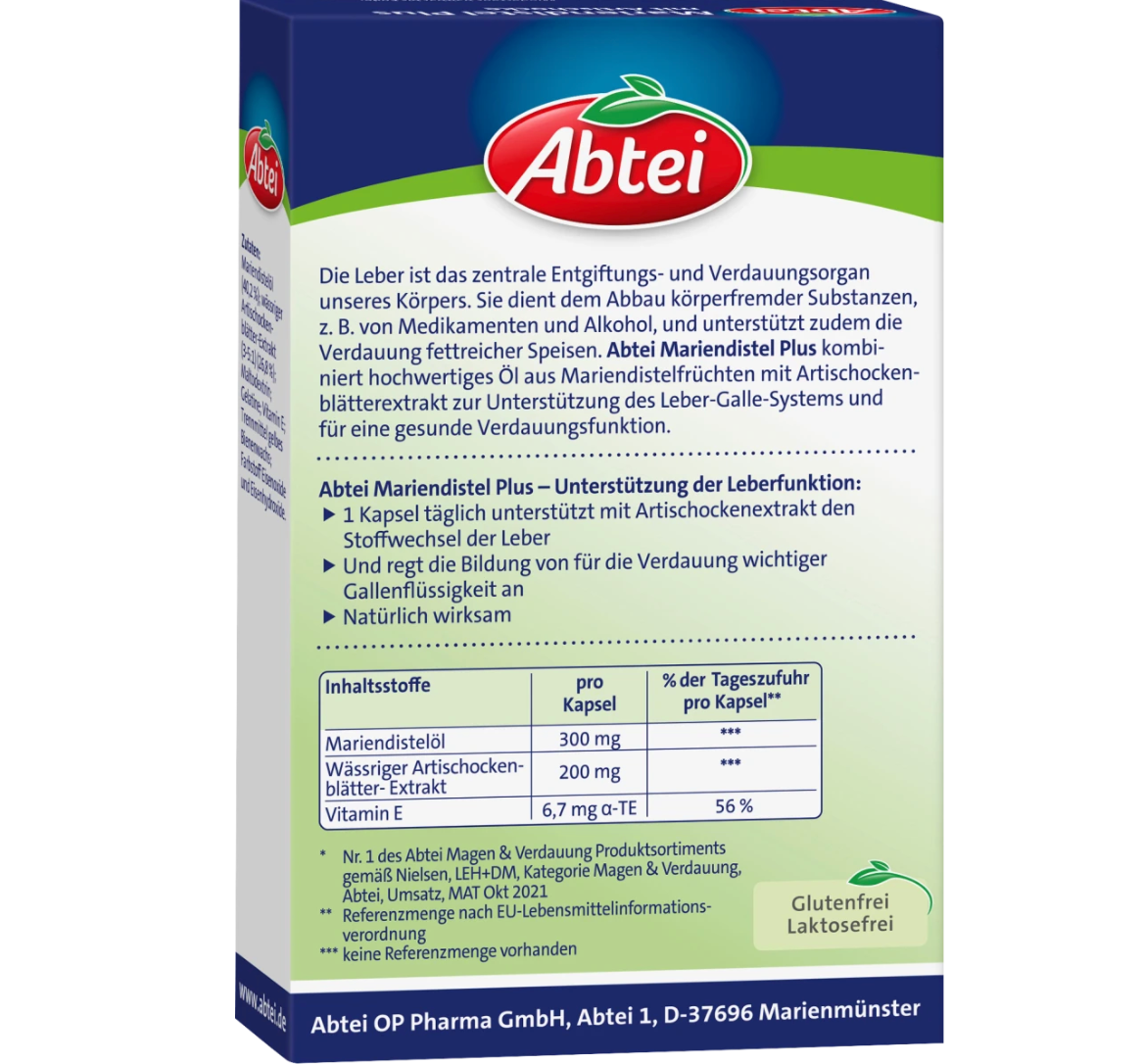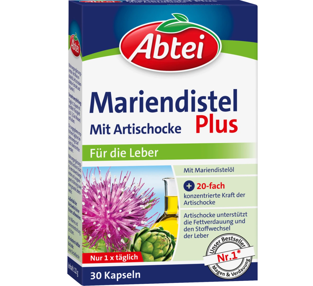 Abtei Mariendistel Plus Capsules combine high-quality milk thistle oil with artichoke leaf extract to support liver function. The milk thistle capsules contain the 20-fold concentrated power of artichoke. One capsule daily supports liver metabolism with artichoke and is naturally effective. Our liver is as irreplaceable as it is versatile: it is the metabolic center, glycogen storage, and also the detoxification and digestive organ of our body. It also breaks down foreign and harmful substances such as medications and alcohol, and additionally supports the digestion of fatty foods.