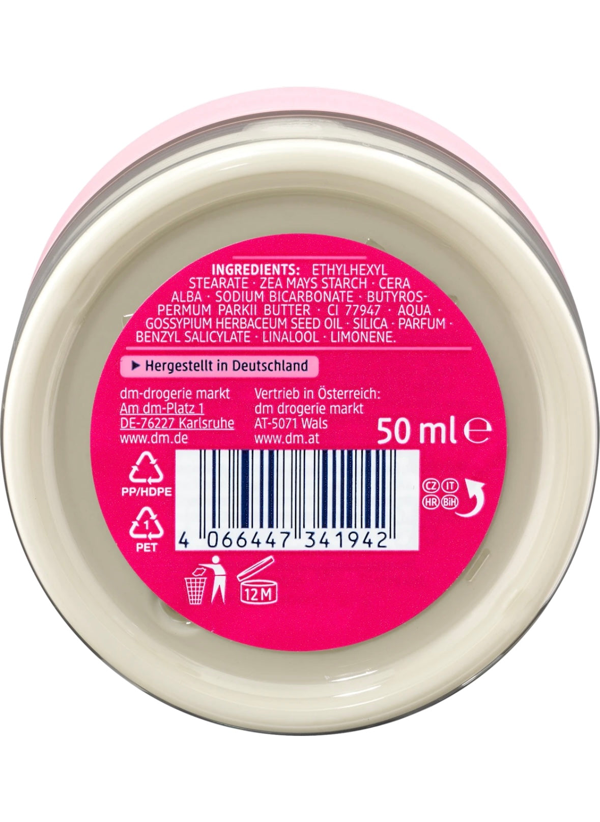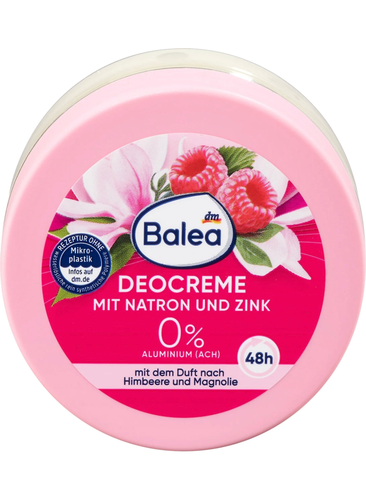 The rich formula of Balea Raspberry Deocream with baking soda and zinc provides 48-hour deodorant protection. Thanks to the naturally effective baking soda, the fruity-scented texture cares for the underarms. Additionally, the aluminum-free formula effectively counteracts the breakdown of sweat and the associated odor formation. Formula free from microplastics and purely synthetic polymers.