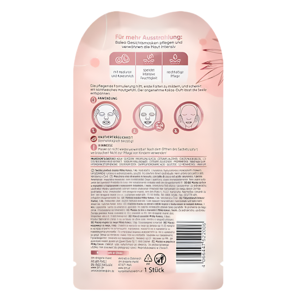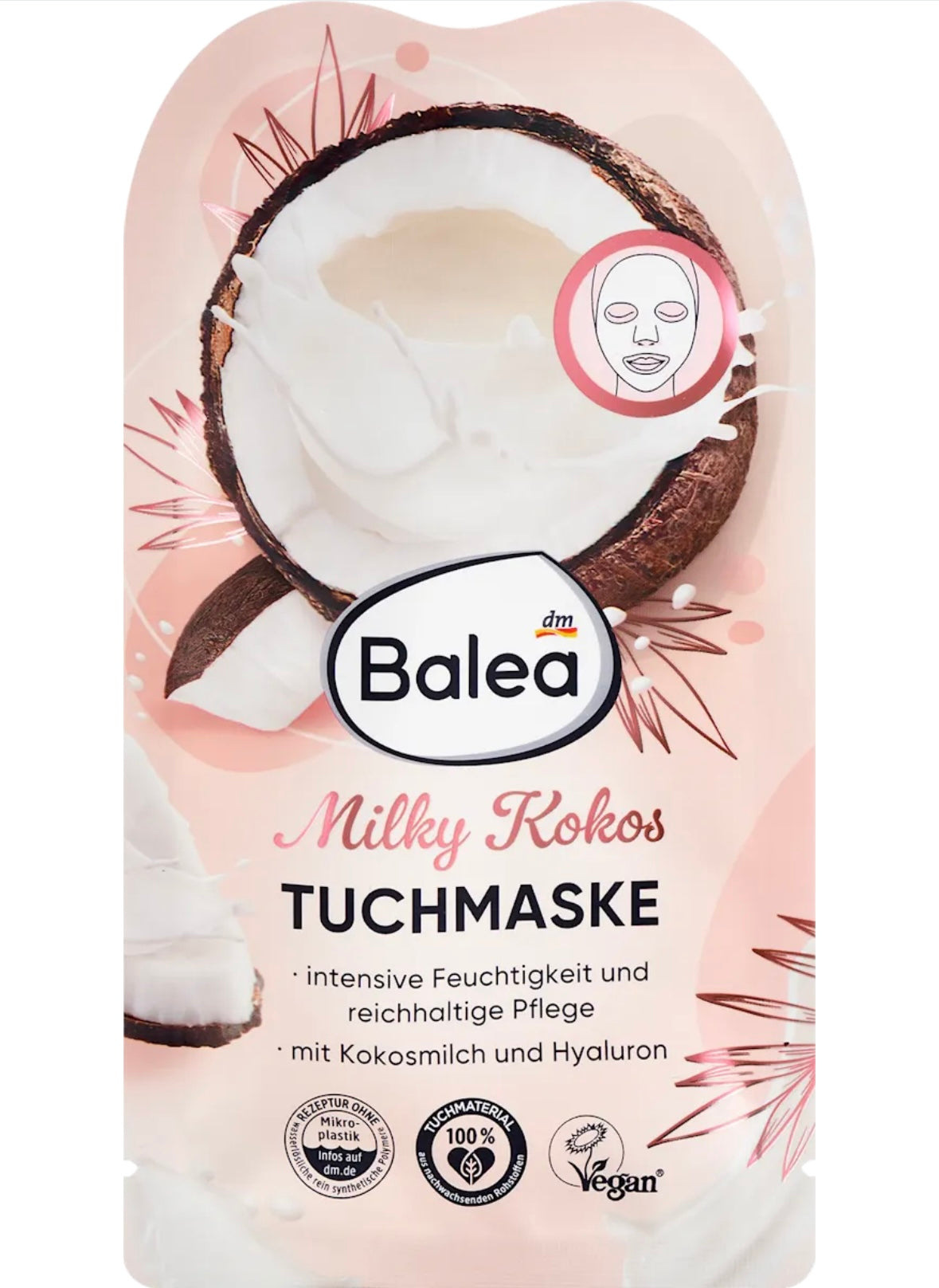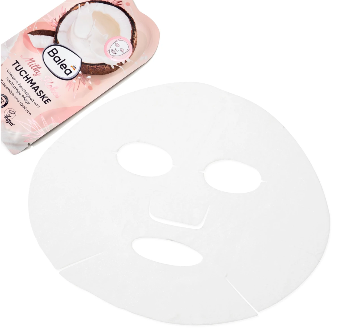 The Balea Milky Coconut sheet mask provides intense moisture and leaves the skin feeling silky soft. The nourishing formula with coconut milk and hyaluronic acid helps reduce the appearance of fine lines. The sheet mask gently conforms to every facial contour, ensuring optimal absorption of active ingredients. Its pleasant coconut scent soothes the soul. Formula free from microplastics and water-soluble purely synthetic polymers.