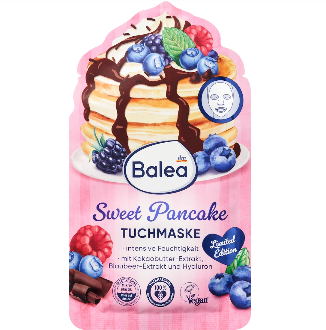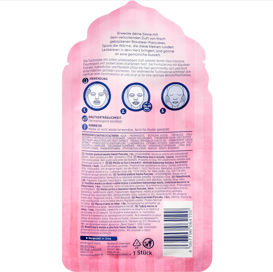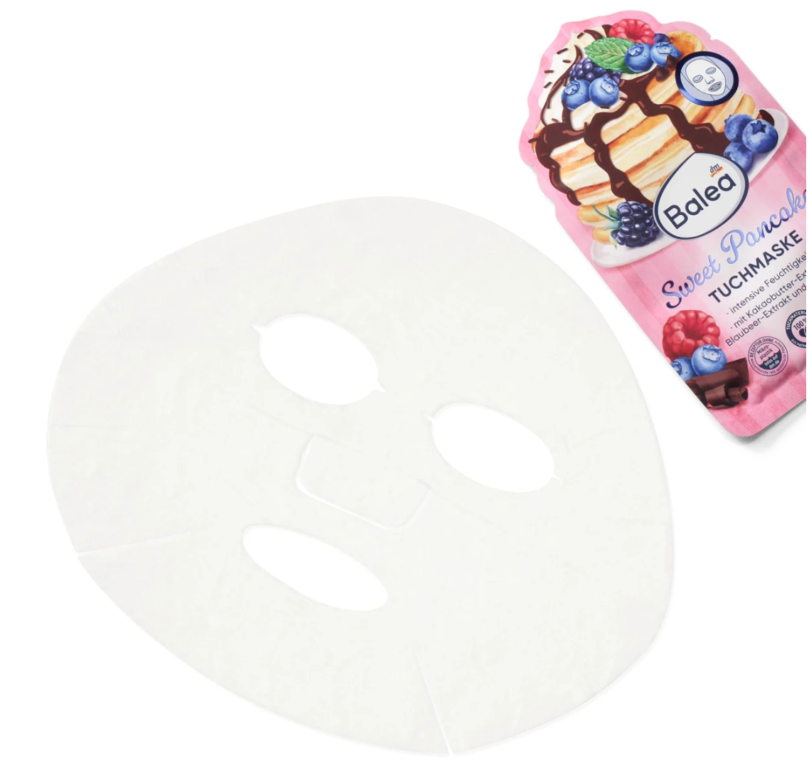 The Sweet Pancake Sheet Mask by Balea contains cocoa butter extract, blueberry extract, and hyaluronic acid. It provides the skin with intense moisture and leaves a sweet chocolaty scent. The sheet material adapts to every facial contour, allowing for optimal absorption of the active ingredients.